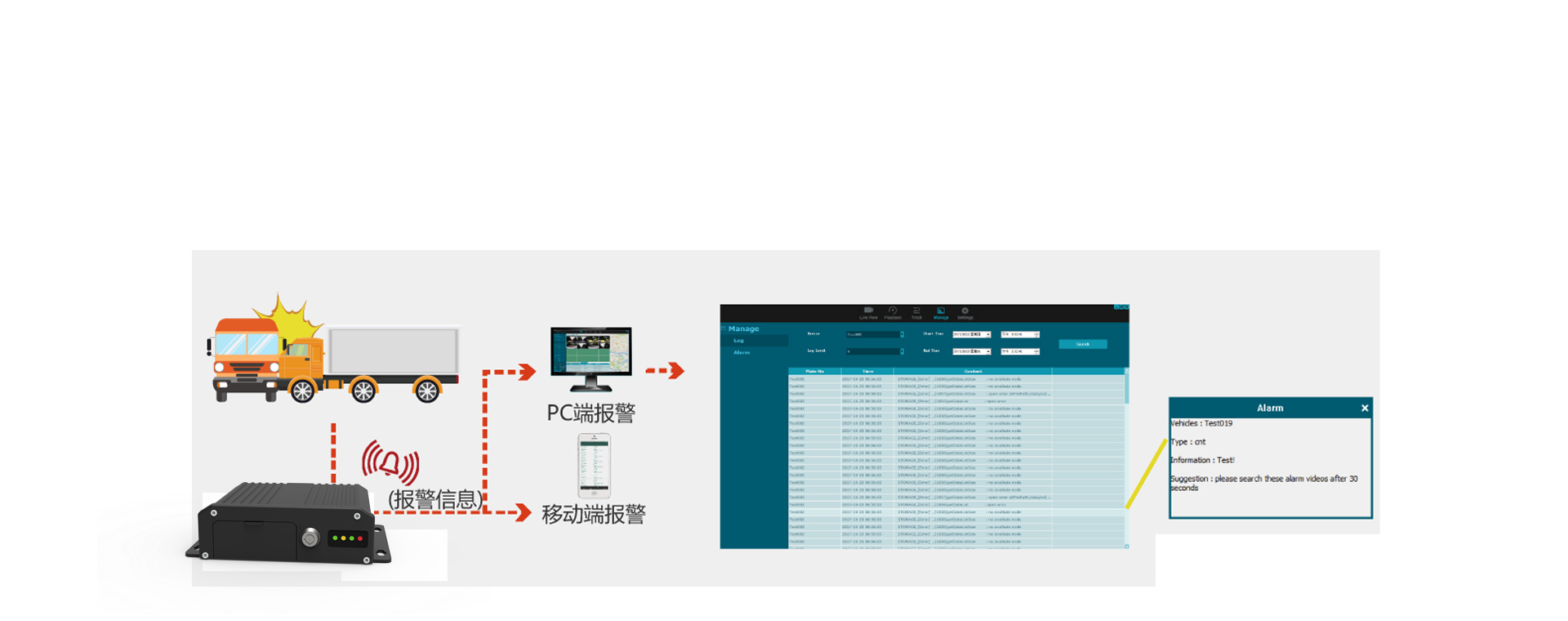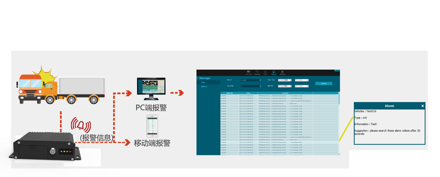 Includes motion-triggered recording, G-sensor-triggered recording, overspeed-triggered recording, custom alarm input-triggered recording, and remote control-triggered recording, along with full DMS/ADAS alarms. Supports 15-second pre-recording to capture video footage prior to an event, facilitating evidence collection.